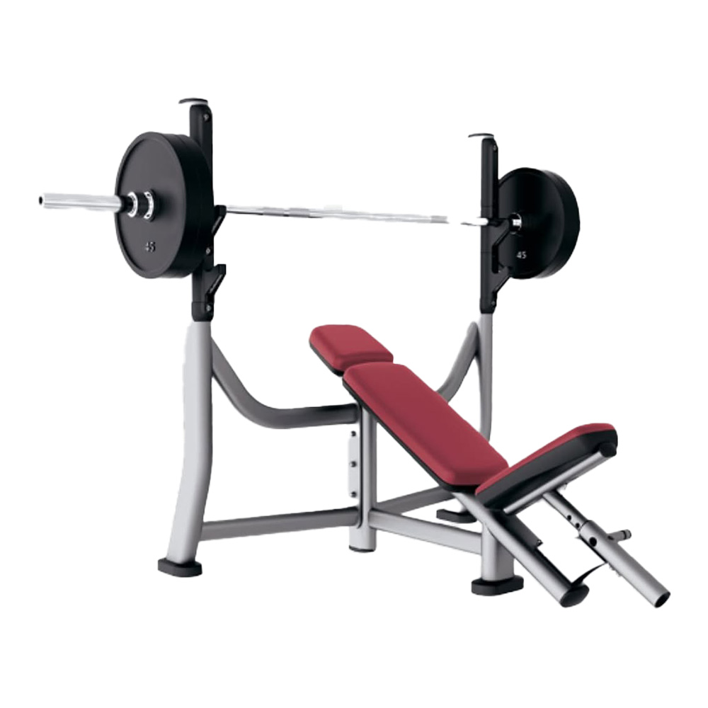 The Signature Olympic Incline Bench features molded urethane protective racking that limits noise and protects the bar from wear for a stable and precise workout.