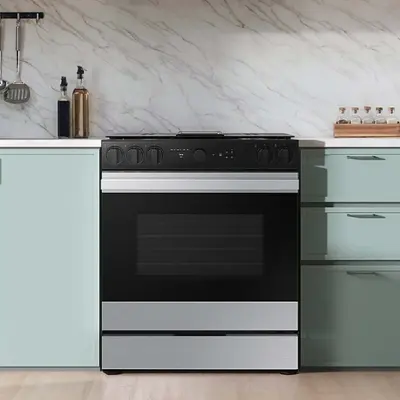 Samsung’s smart gas range features an integrated Smart Oven Camera that lets you monitor your food closely and make and share time-lapse videos to your social media to show off your culinary skills. Illuminated Precision Knobs let you know if your cooktop is on from a distance and precisely control and ensure proper activation of your cooktop. This range’s Bespoke design with a recessed handle will seamlessly blend into your kitchen for an elegant and minimalist look.