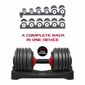 Maximize your strength training with minimal equipment using the FitRx SmartBell! This adjustable dumbbell lets you customize the SmartBell’s weight in increments ranging from 5 to 52.5 pounds. The simple one-handed quick-select design makes it easy to use: just grip the handle and rotate it towards your desired weight.